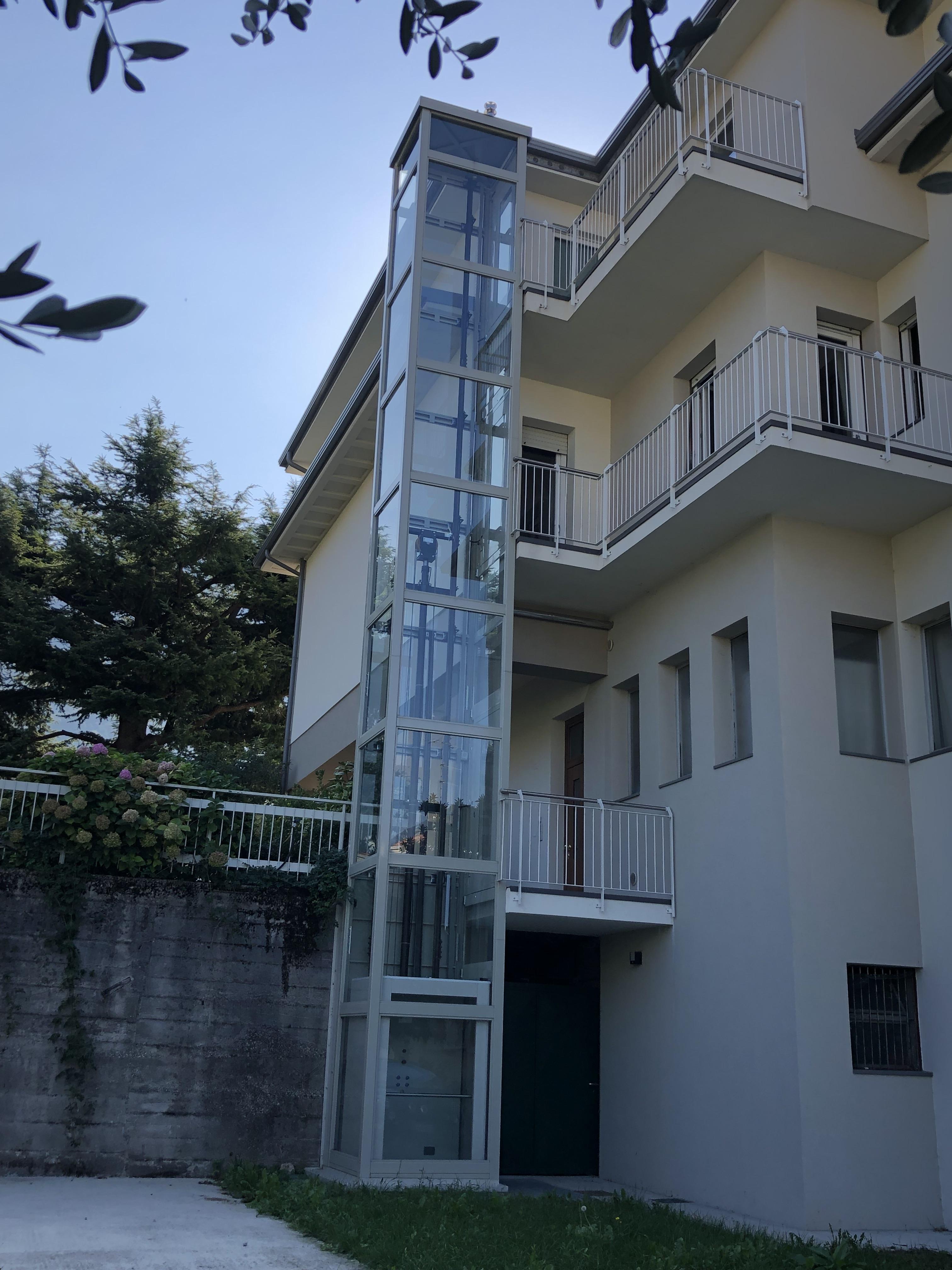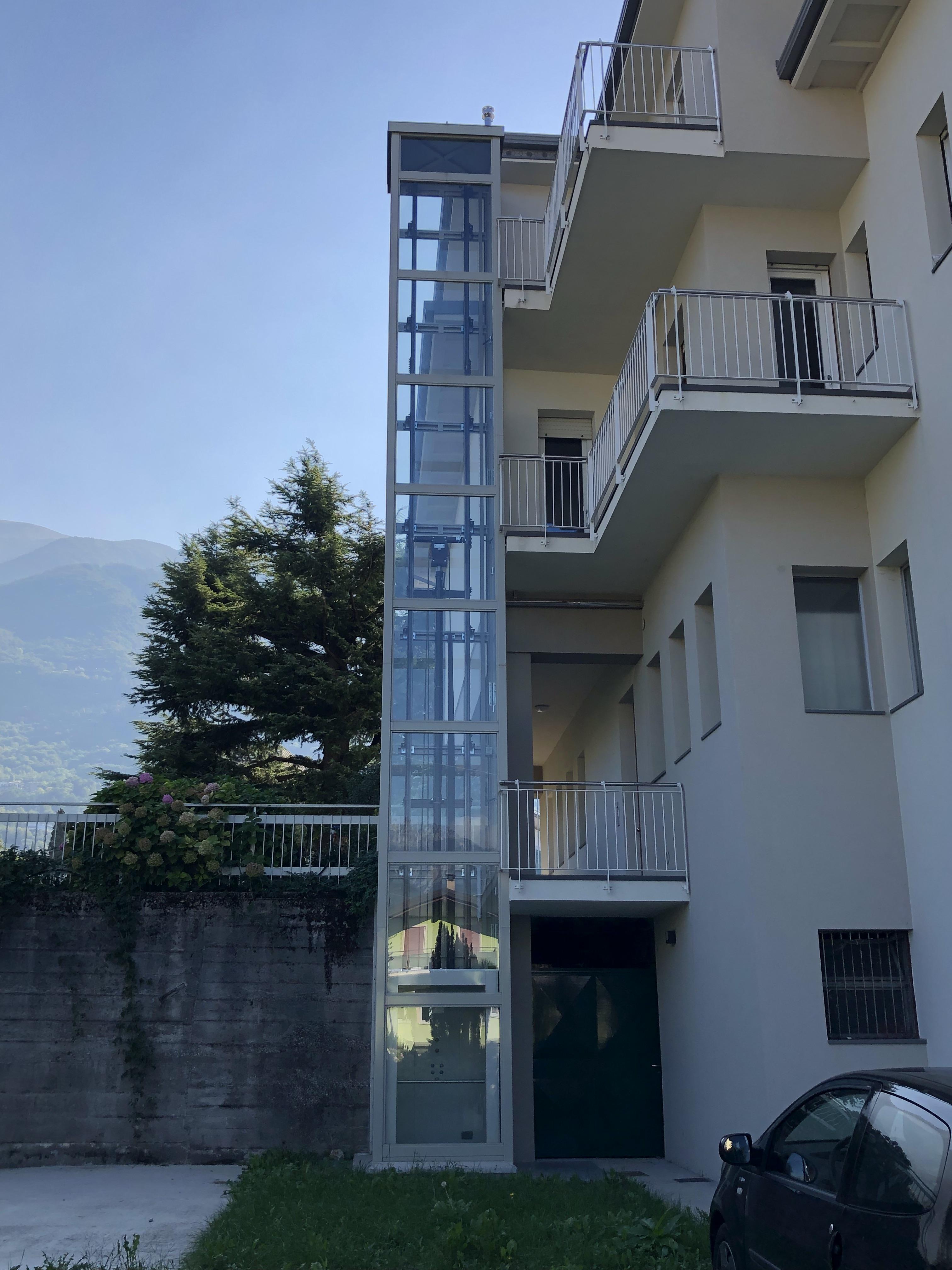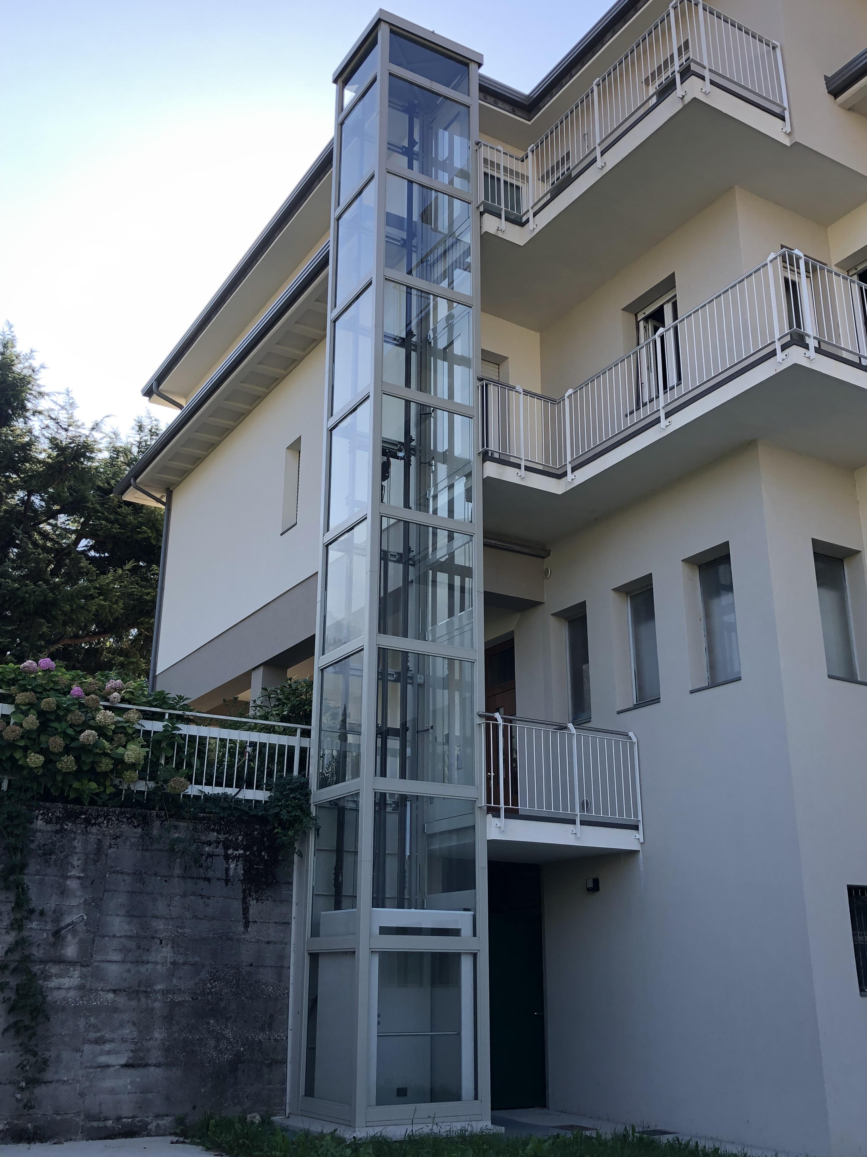 Abbiamo realizzato un ascensore panoramico esterno idraulico installato in un condominio presso Bolognano di Arco (TN), con struttura esterna con tamponamento in vetro trasparente e cabina con parete panoramica.
